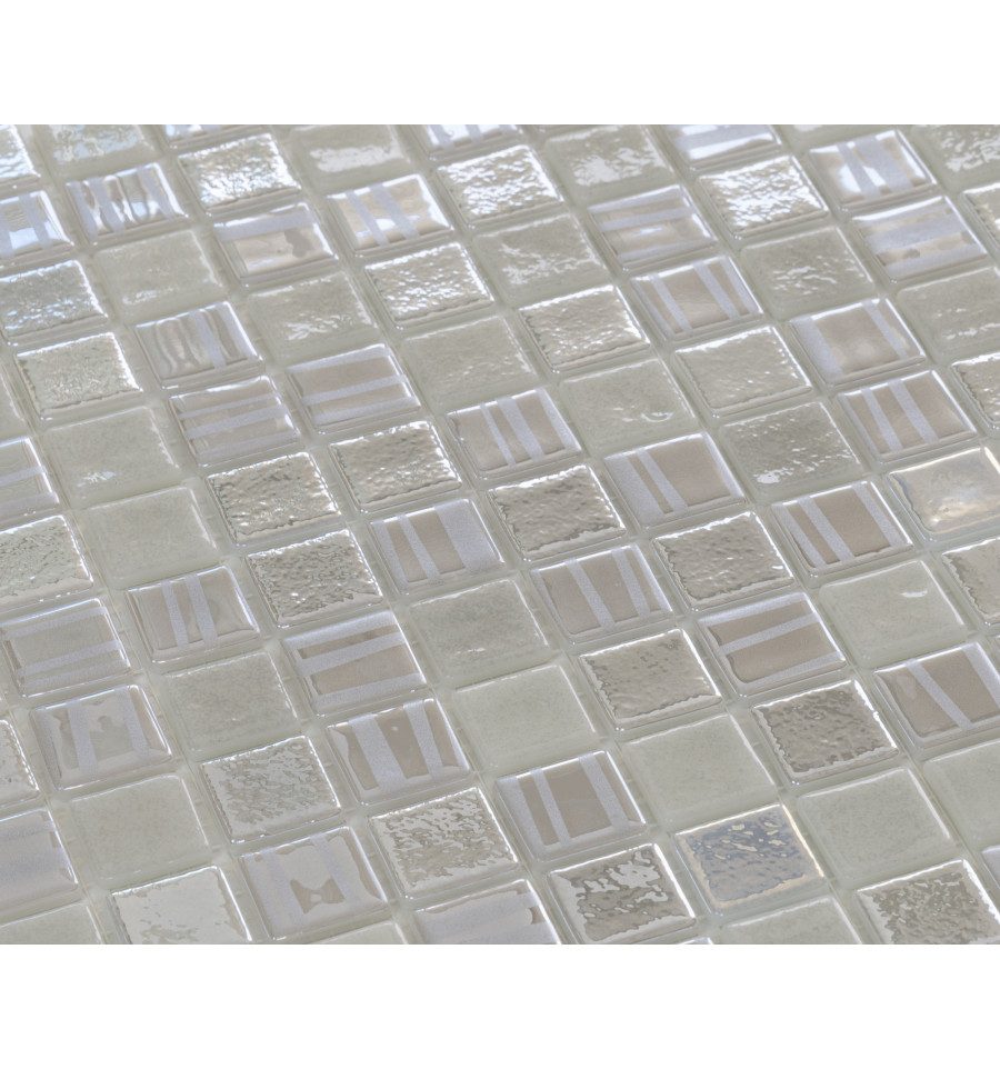 Испанская стеклянная мозаика с верхним напылением цвета, поверхность глянцевая, перламутровая. Подходит как для оформления интерьеров, так и для облицовки бассейнов и влажных зон.