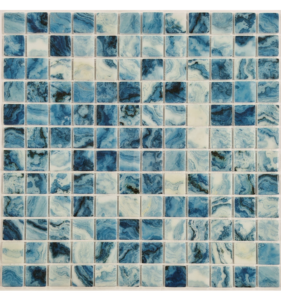 Испанская стеклянная мозаика с глянцевой поверхностью под натуральный мрамор (камень). Подходит как для оформления интерьеров, так и для облицовки бассейнов и влажных зон.