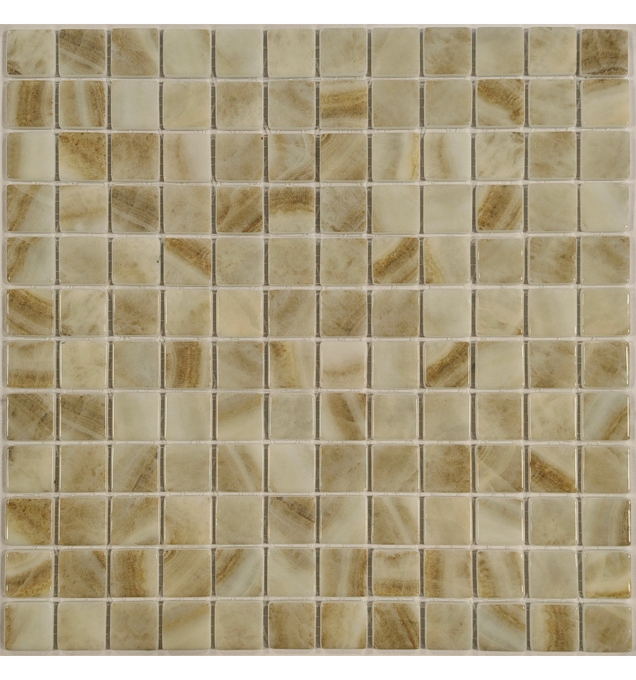 Испанская стеклянная мозаика с глянцевой поверхностью под натуральный оникс. Подходит как для оформления интерьеров, так и для облицовки бассейнов и влажных зон.